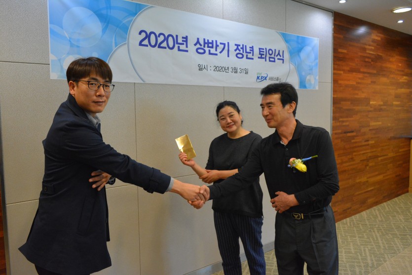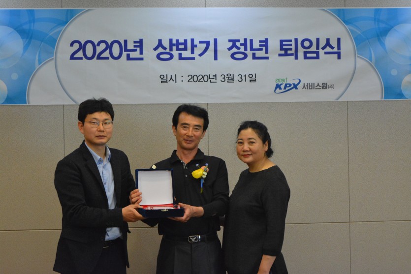 2020년 3월 31일 상반기 정년퇴임식 페이지 정보 작성자 KPX 서비스원(주) 작성일20-04-02 10:25 본문 케이피엑스서비스원 주식회사 (대표이사 송광헌)는 2020 3월 31일 상반기 정년퇴임식 행사를 진행하였습니다. 서비스원 본사에서는 시설관리팀 이덕경 과장님이, 전력거래소 중부지사에서는 특수경비팀 백무승 조장님의 퇴임식이 각각 진행되었습니다. 퇴임식에는 퇴직자 가족 노조 지회장을 비롯해 전력거래소 사옥관리팀, 중부지사 직원들과 함께 일한 동료들이 대거 참석해 자리를 빛내 주었습니다. 또한, 퇴직자들께 감사패와 전별금도 전달했습니다. 목록 이전글2020년 사랑의 헌혈 행사 20.07.07 다음글2019년 12월 31일 종무식 20.01.08